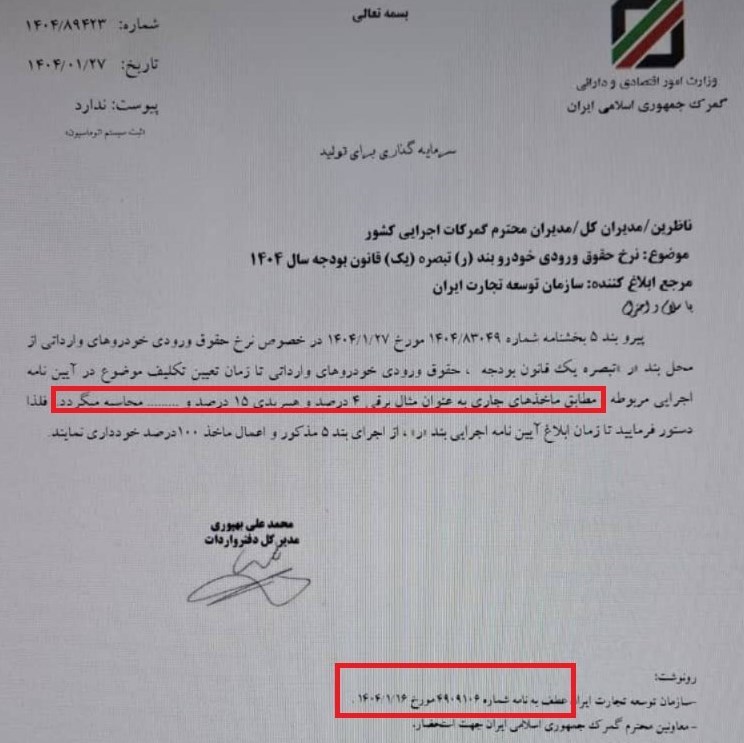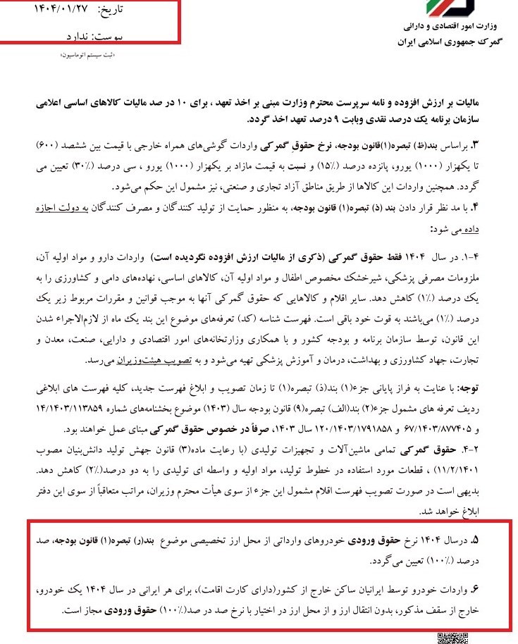 ابتدا بخشنامه زیر در تاریخ ۲۷ فروردین ماه در خصوص احکام گمرکی بودجه ۱۴۰۴ و اعمال عوارض ۱۰۰ درصدی واردات خودرو در سال جاری منتشر شده است.