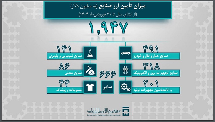 بر این اساس از ابتدای سال جاری تا ۳۱ فروردین ماه ۱۴۰۴ میزان کل تأمین ارز صنایع مبلغ یک میلیارد و ۹۴۷ میلیون دلار بوده است که میزان ارز تأمینی برای گروه های «صنایع حمل و نقل و خودرو» ۴۹۱ میلیون دلار، «صنایع تجهیزات برق و الکترونیک» ۳۱۸ میلیون دلار، «ماشین آلات و تجهیزات تولید» ۲۰۱ میلیون دلار، «صنایع شیمیایی و پلیمری» ۱۴۱ میلیون دلار، «صنایع معدنی» ۸۶ میلیون دلار، «منسوجات و پوشاک» ۴۴ میلیون دلار و «سایر صنایع» ۶۶۶ میلیون دلار تا پایان روز ۳۱ فروردین ماه سال جاری بوده است.