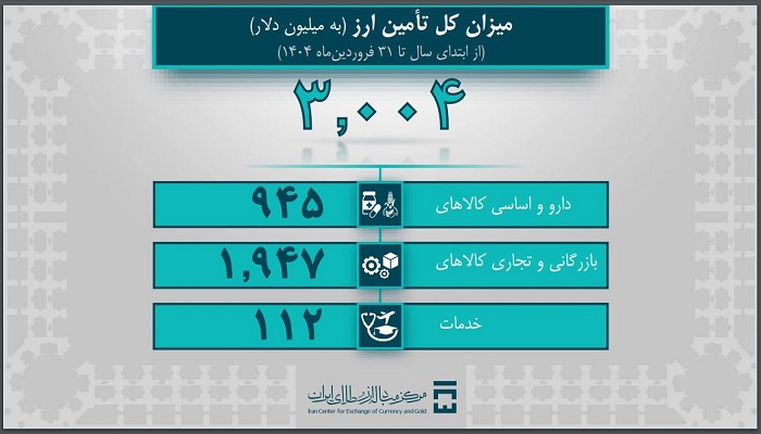 بر اساس این گزارش از ابتدای سال جاری تا ۳۱ فروردین ماه بانک مرکزی مبلغ ۳ میلیارد و ۴ میلیون دلار ارز برای واردات کالاهای اساسی و دارو، تجاری و بازرگانی و خدمات، تامین کرده است. در این مدت برای کالاهای اساسی و دارو ۹۴۵ میلیون دلار، برای کالاهای تجاری و بازرگانی مبلغ یک میلیارد و ۹۴۷ میلیون دلار و برای خدمات ۱۱۲ میلیون دلار تأمین ارز صورت گرفته است.
