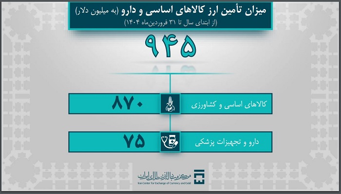 بر اساس این گزارش، بانک مرکزی برای واردات کالاهای اساسی و کشاورزی ۸۷۰ میلیون دلار و برای دارو، مواد اولیه دارویی و تجهیزات پزشکی ۷۵ میلیون دلار ارز تأمین کرده است و در مجموع طی مدت مذکور ۹۴۵ میلیون دلار برای کالاهای اساسی و کشاورزی و دارو و تجهیزات پزشکی را با نرخ ۲۸۵۰۰ تومان و با هدف حمایت از مصرف‌کنندگان و دسترسی اقشار جامعه به کالاهای ضروری با قیمت ارزانتر تأمین شد.