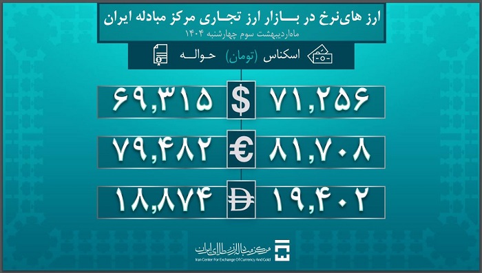 گفتنی است، نرخ بازار ارز تجاری در روز چهارشنبه ۳ اردیبهشت ‌ماه ۱۴۰۴ در تالار حواله ارز مبادله دلار با نرخ ۶۹ هزار و ۳۱۵ تومان، مبادله یورو با نرخ ۷۹ هزار و ۴۸۲ تومان، مبادله درهم با نرخ ۱۸ هزار و ۸۷۴ تومان بود. همچنین در تالار اسکناس ارز، دلار با نرخ ۷۱ هزار و ۲۵۶، یورو با نرخ ۸۱ هزار و ۷۰۸ تومان و درهم با نرخ ۱۹ هزار و ۴۰۲ تومان مورد مبادله قرار گرفت.