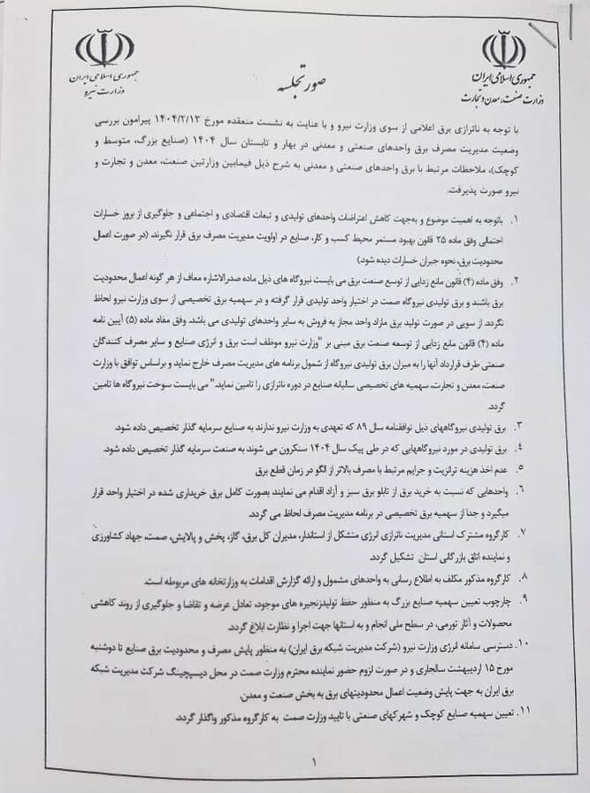 با توجه به ناترازی برق اعلامی از سوی وزارت نیرو و با عنایت به نشست منعقده مورخ ۱۴۰۴.۲.۱۳ پیرامون بررسی وضعیت مدیریت مصرف برق واحدهای صنعتی و معدنی در بهار و تابستان سال ۱۴۰۴) (صنایع بزرگ، متوسط و کوچک) ملاحظات مرتبط با برق واحدهای صنعتی و معدنی به شرح ذیل فیمابین وزارتین صنعت، معدن و تجارت و سرو صورت پذیرفت.
