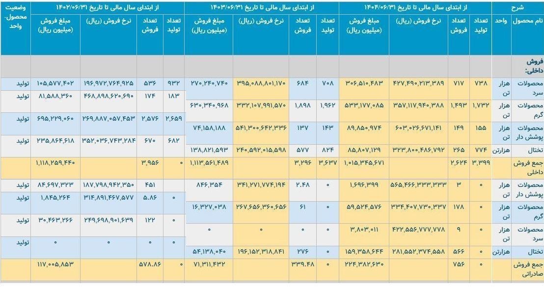 همچنین در بخش فروش، در ۶ ماهه اول سال ۱۴۰۲ میزان فروش این شرکت در داخل کشور ۳ میلیون و ۹۵۶ هزار تن بوده است. میزان فروش در داخل کشور در ۶ ماهه اول سال ۱۴۰۳ به ۳ میلیون و ۲۹۶ هزار تن و در ۶ ماه اول سال ۱۴۰۴ به ۲ میلیون و ۶۲۴ هزار تن رسیده است.