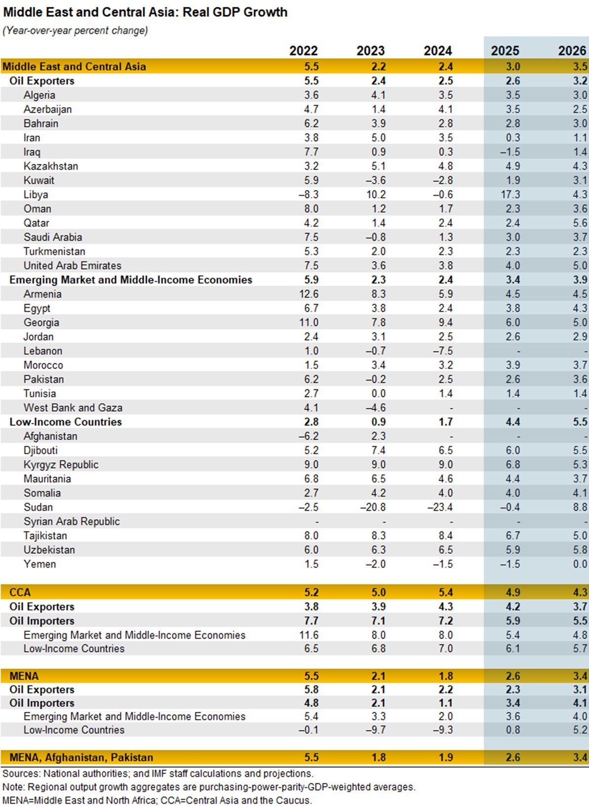 صندوق بینالمللی پول رشد منطقه خاورمیانه و شمال آفریقا (MENA) را برای سال ۲۰۲۵ برابر ۳ درصد پیشبینی کرده است. این رقم نسبت به پیشبینی انتشار قبلی در اکتبر ۲۰۲۴ کاهش یافته است. همچنین پیش بینی رشد اقتصادی منطقه در ۲۰۲۶، حدود ۳.۵ درصد خواهد بود.
