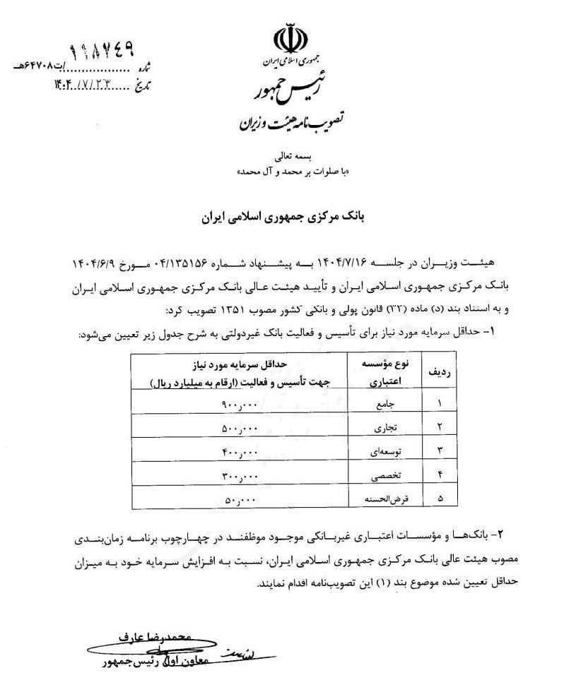 به گزارش شاخص ۳۶۰، محمدرضا عارف معاون اول رئیس جمهور تصویبنامه هیأت وزیران در خصوص حداقل سرمایه لازم برای تأسیس و فعالیت بانک غیر دولتی را به بانک مرکزی ابلاغ کرد.