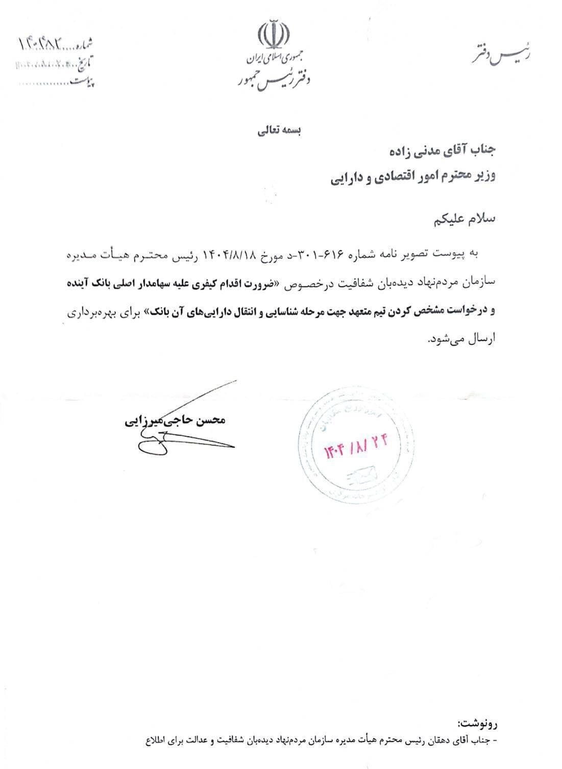 به گزارش خبرگزاری تسنیم، دفتر رئیس‌جمهور با ارسال نامه‌ای به وزیر امور اقتصادی و دارایی، دستور «اقدام کیفری علیه سهامدار اصلی بانک آینده» و «تشکیل تیم متعهد برای شناسایی و انتقال دارایی‌های این بانک» به وزیر اقتصاد ابلاغ کرد.